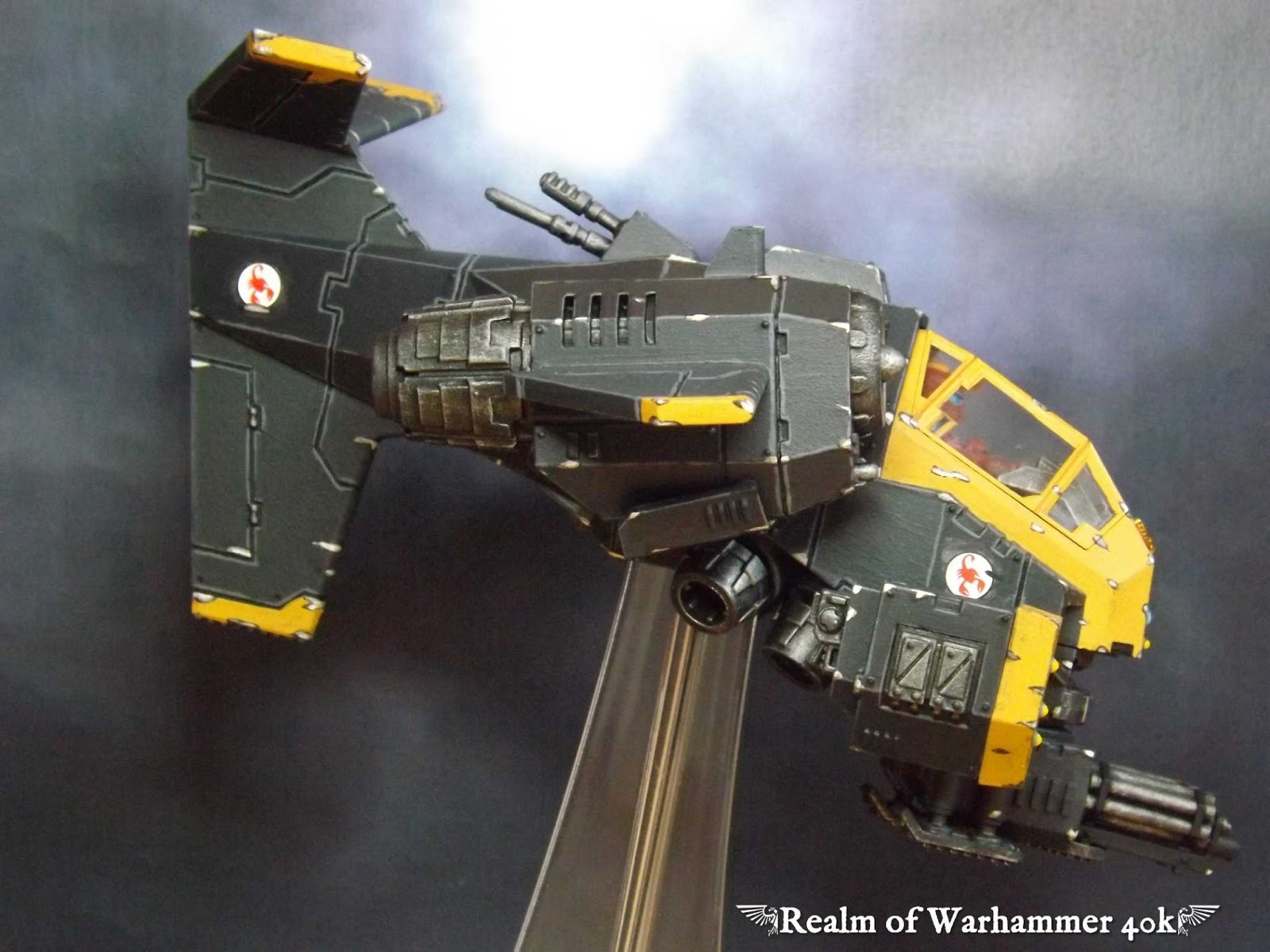 Even from the rear you can still see the Red Scorpions Icons, also the yellow on the wings and tail tips frame it beautifully. You can't see it that well in the photo, but the Cog of the Mechanicum has been painted on the belly and another Red Scorpion transfer added to the underside.
